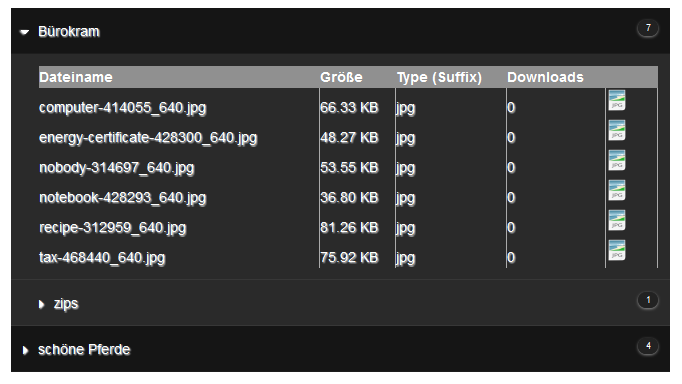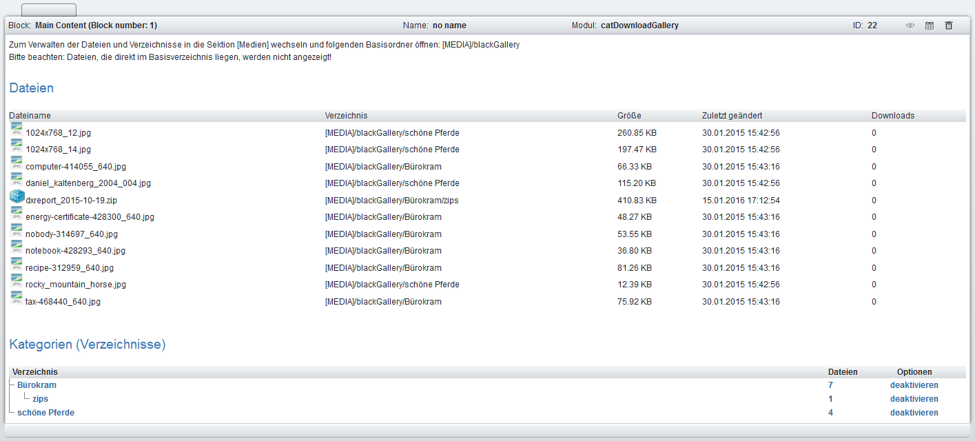 Das Modul entstand auf Wunsch eines Forenbenutzers. Die Kategorien und Dateien basieren komplett auf der Verzeichnisstruktur des konfigurierten Basisverzeichnisses. Aus diesem Grund gibt es auch nur wenig einzustellen. Die Möglichkeiten sind bewußt eingeschränkt.