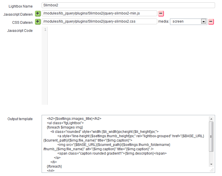 Im Falle der Slimbox2 ist das Feld für den Javascript-Code leer, da kein weiterer Code benötigt wird. Bei anderen Plugins kann mehr oder weniger umfangreicher Zusatzcode nötig sein. Im Lauf der Zeit, wenn die blackGallery öfter verwendet wird, wird eine Sammlung von weiteren Lightbox-Konfigurationen entstehen.