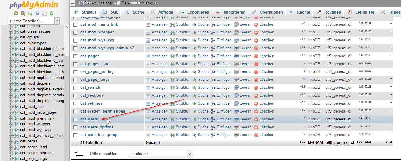 Öffnen Sie phpMyAdmin und suchen Sie die Tabelle cat_user und überprüfen Sie nochmal den Tabellenpräfix.
