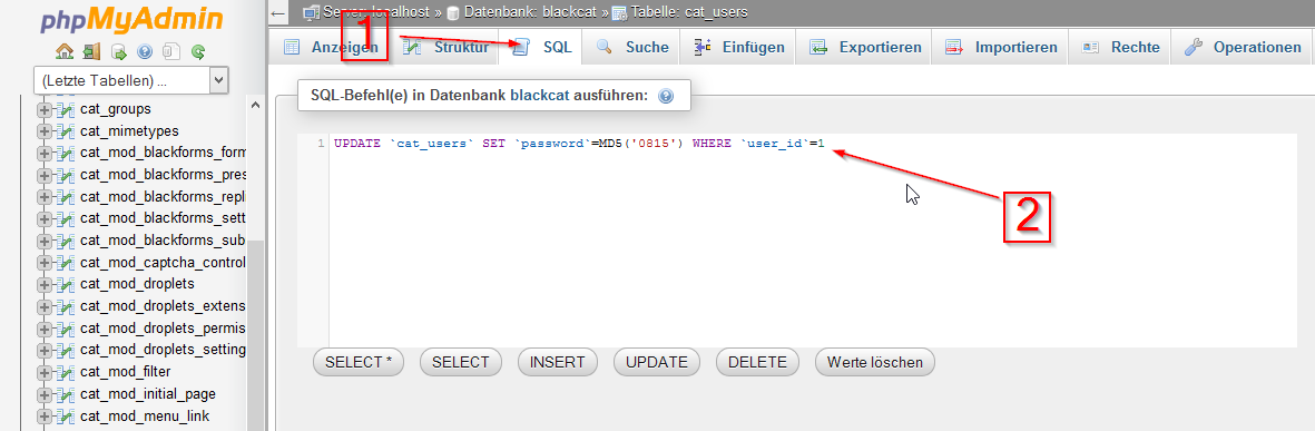 Klicken Sie am oberen Rand auf SQL [1] und anschließend geben Sie den SQL-Befehl [2] wie oben beschrieben ein (Copy and Paste geht auch).