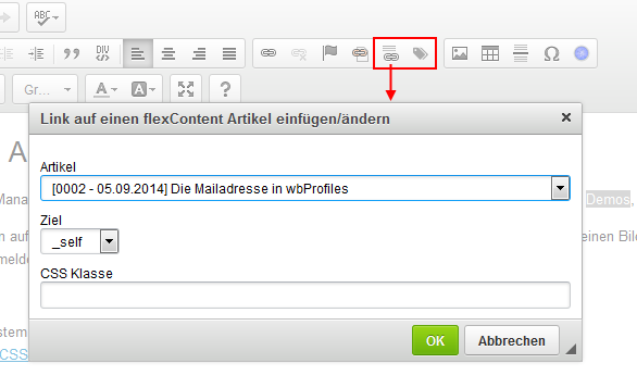 flexContent bringt einen eigenen CKEditor mitsamt Plugins mit. Mit Hilfe der Plugins lassen sich in flexContent-Artikeln Links zu anderen Artikeln und Schlagworten (Hashtags) unterbringen.